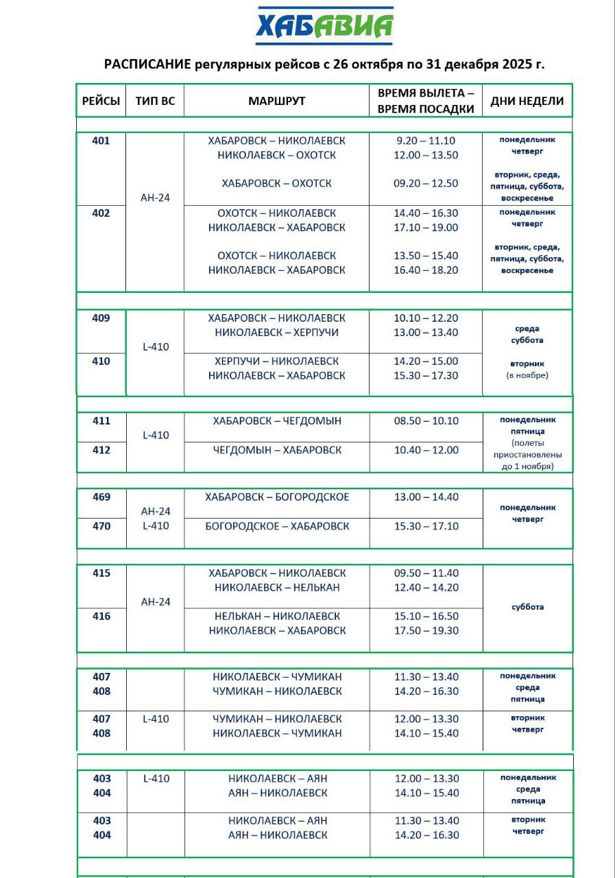 РАСПИСАНИЕ с 30 марта по 25 октября 2025 г.